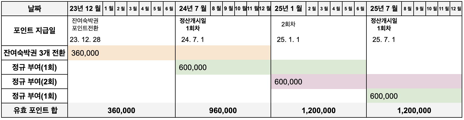 정산개시일이 7월 1일인 분양가 3억의 객실을 소유하고, 2023년 12월 27일 기준 무료숙박권 3개가 남은 가상의 위탁계약자의 경우, 계약기간 내 매 연차에 발생하는 포인트는 120만 포인트로, 정산개시일과 정산개시일의 6개월 후 각각 60만 포인트가 지급됩니다. 포인트의 유효기간은 지급일 기준 1년으로 숙박 포인트의 지급과 특정 시점에서의 유효 포인트의 합을 알 수 있습니다.