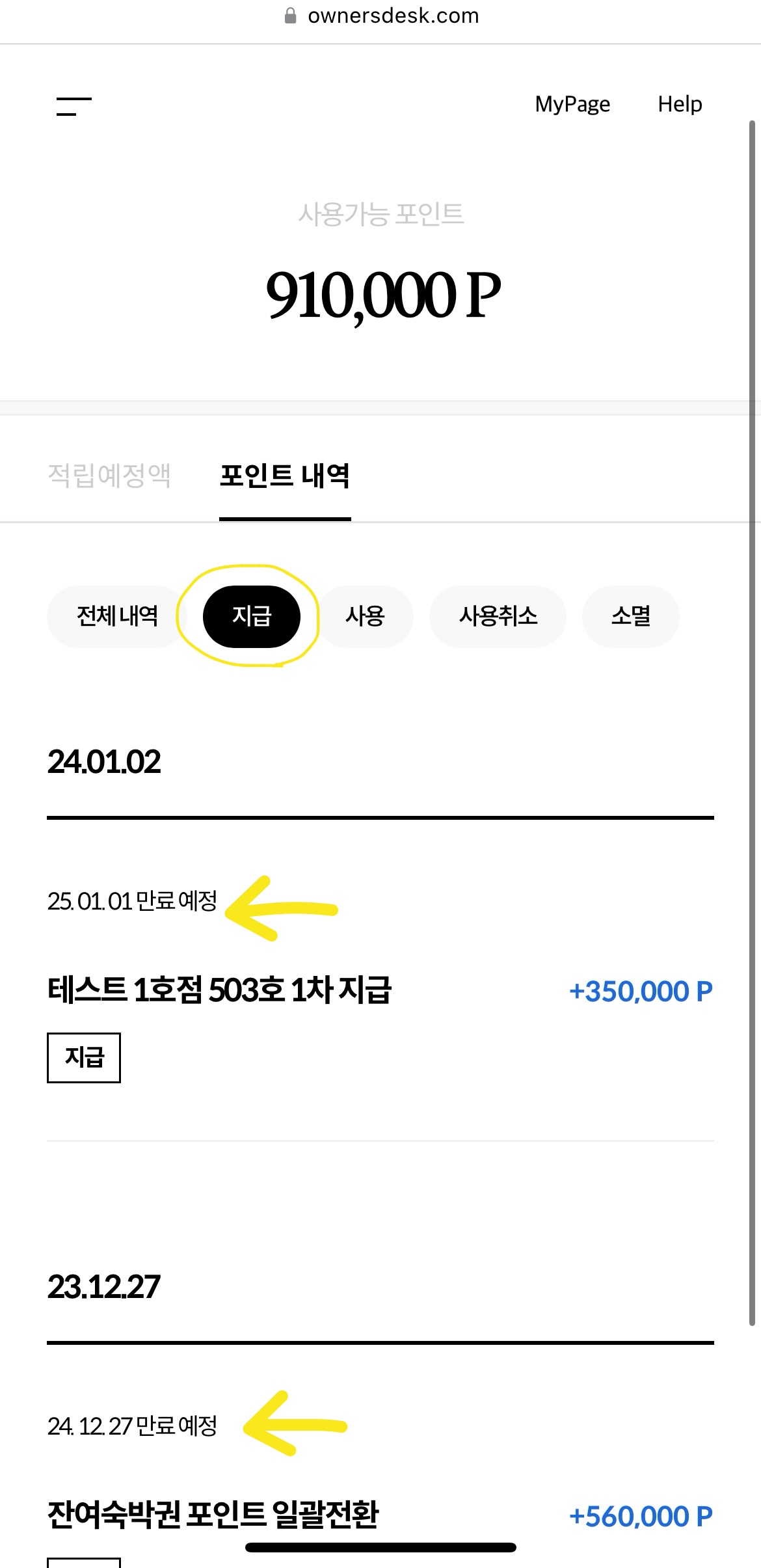 지급된 포인트 마다 만료 예정일이 기재되어 있습니다.