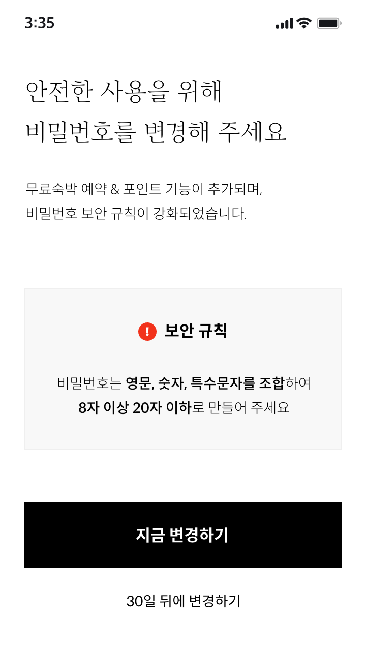 변경을 원치 않을 경우 : '30일 뒤에 변경하기'를 누른다. (약 30일 이후 동일한 알림창이 보입니다.)