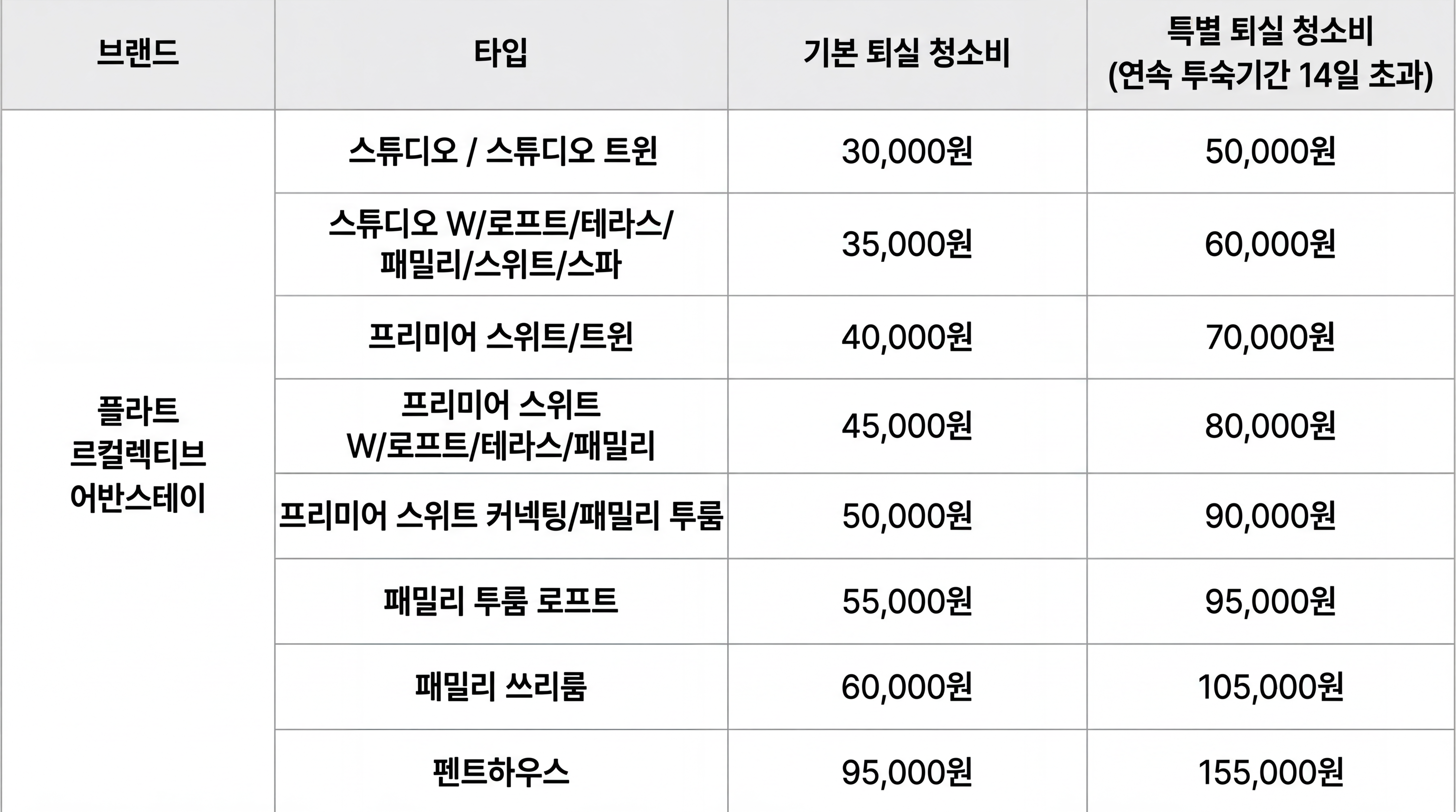 ※ 연속 투숙기간이 14일을 초과하는 경우, 특별 퇴실 청소비로 반영됩니다.