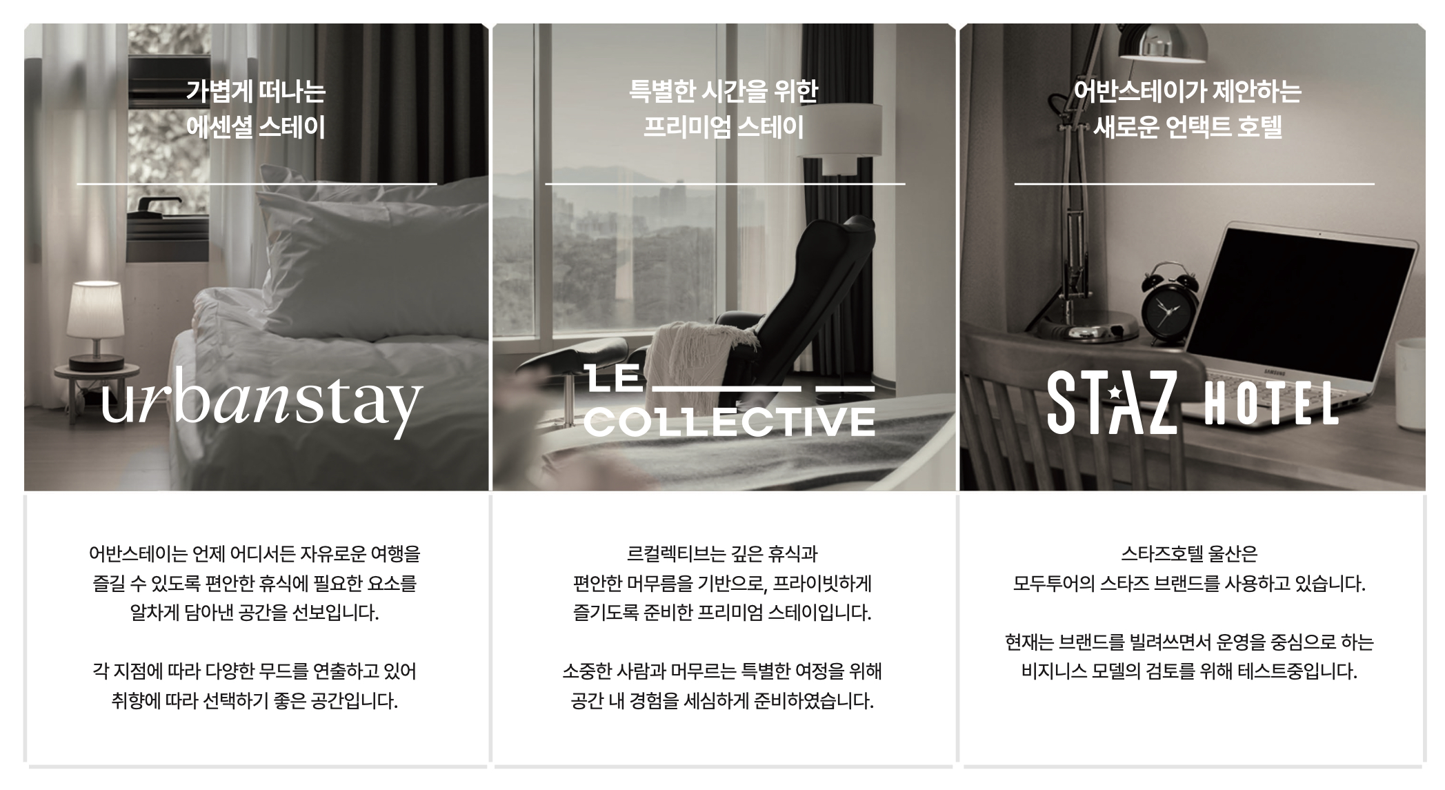 핸디즈는 어반스테이, 르컬렉티브, 스타즈호텔 울산 총 3개의 브랜드를 운영하고 있습니다. 레지던스부터 호텔까지 다양한 라이프스타일의 공간을 제공하고 있습니다.